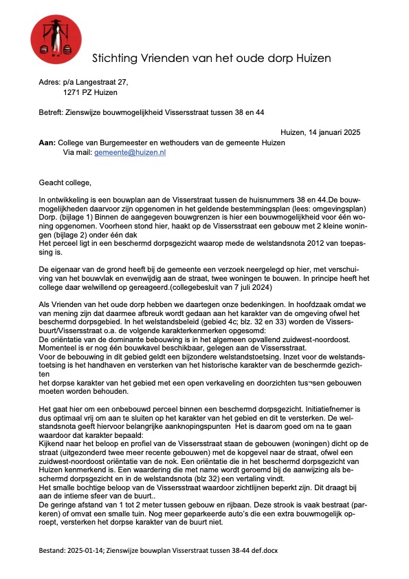 De Stichting Vrienden van het Oude dorp Huizen heeft een zienswijze ingediend tegen het voornemen om een bestaande bouwmogelijkheid voor één woning aan de Visserstraat tussen 38 en 44 te verruimen naar twee woningen. De plannen komen 7 mei aan de orde in de vergadering van de Commissie Fysiek Domein. Omdat de Stichting geen uitnodiging voor deze bijeenkomst heeft ontvangen, heeft zij deze zienswijze schriftelijk voorgelegd.